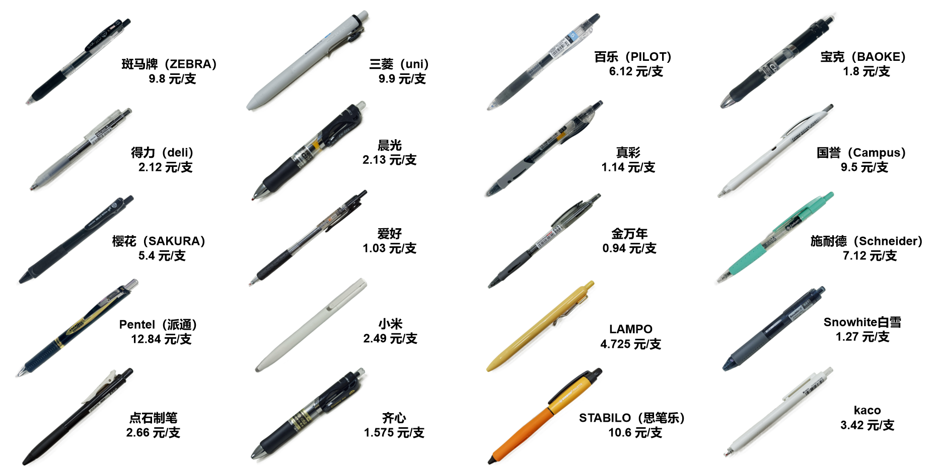 本次比较试验的20款中性笔样品◇=◇,其中12款国内品牌样品的平均价格2◆▽▷.11元/支;8款国外品牌样品的平均价格8.91元/支▲▽。