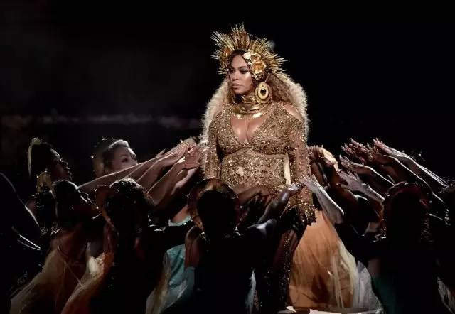 碧昂斯当天的妆容和造型是女神雅典娜的金色look,浑身耀眼的金色,从头饰到指甲,任何一处细节都完美,而作为孕妇的她隆起的腹部,让整个造型又镀上了一层母性的光辉。